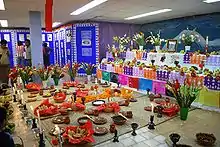 Day of the Dead is the most important celebration in this community, with two days of ritual and cultural events from November 1 to 2.[8] The village and its church graveyard has become famous in the Mexico City metropolitan area for this.[9] In and around the cemetery, thousands of Mexican and international visitors experience the sights, sound and smells of the rituals, cultural events and stands selling food, crafts and other items.[10] The modern celebrations are an extension of the cult of the dead that existed here since pre-Hispanic times. Excavations in this area have revealed a large quantity of stone skulls that used to adorn the facades of homes in this area.[5] Solemn commemoration and festivities do not compete here; both are considered part of the event.[11] In addition to the traditional altars to the dead called “ofrendas”, grave cleanings and decoration, there are also plays, processions, poetry readings, concerts and folk dance. In 2009, the finale was a concert by Susana Harp.[8]