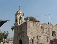 Only one quadrangular basement currently survives, which might have been one of the site's main structures. It consists of a large staircase leading up to a temple. Like Tenayuca, it is thought that the temple was dedicated to the worship of Huitzilopochtli and Tlaloc. The construction method was probably the characteristic one of successive structures, one on top of the other, and at least four successive time periods have been detected. Today, the inside of the pyramid is one of the best preserved interior structures. The exterior structures were removed and many of their stones were used to build the adjacent church, which dates back to the late 16th century. In 1962, the architect and archaeologist Eduardo Pareyon Moreno reconstructed and reinforced the pyramid's basement and rebuilt the temple that crowns it. Although such a reconstruction certainly does not comply with current canons of archaeology, the product is a beautifully delineated Mexica pyramid, one of the best-conserved examples of this culture.