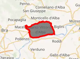 Santa Vittoria d'Alba is a comune (municipality) in the Province of Cuneo in the Italian region Piedmont, located about 45 kilometres (28 mi) southeast of Turin and about 45 kilometres northeast of Cuneo. As of 31 December 2004, it had a population of 2,591 and an area of 10.1 square kilometres (3.9 sq mi).[3]