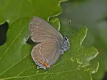 Satyrium ilicis has a wingspan of 32–36 mm.[3] The basic color of the wings is brownish. In the females the upperside of the forewings usually shows large patches of orange, while on the underside of the hindwings there are orange black bordered lunules. A series of irregular broken white markings are present on the underside of the forewings and hindwings. On the hindwings are present two short tails. Larvae are pale green, about 2 cm long.[4]