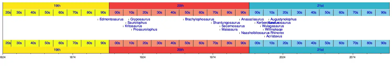 Saurolophinae was first defined as a clade in a 2010 phylogenetic analysis by Prieto-Márquez.[3] Traditionally, the "crestless" branch of the family Hadrosauridae had been named Hadrosaurinae. However, the use of the term Hadrosaurinae was questioned in a comprehensive study of hadrosaurid relationships by Albert Prieto-Márquez in 2010. Prieto-Márquez noted that, though the name Hadrosaurinae had been used for the clade of mostly crestless hadrosaurids by nearly all previous studies, its type species, Hadrosaurus foulkii, has almost always been excluded from the clade that bears its name, in violation of the rules for naming animals set out by the ICZN. Prieto-Márquez (2010) defined Hadrosaurinae as only the lineage containing H. foulkii, and used the name Saurolophinae instead for the traditional grouping.[3]