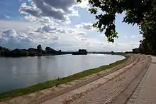 Downstream from confluence of the Drina, the Sava River changes its eastward course to northeast, until it reaches Sremska Mitrovica, from where it flows to the southeast and then south to Šabac, before finally turning east towards Belgrade. Most of the river's course in Serbia represents a border between province of Vojvodina, on the left bank, and Central Serbia, on the right bank. Exceptions to that are in area around Sremska Mitrovica, where both banks are in Vojvodina, and downstream of Progar suburb of Belgrade where both banks are in Central Serbia. The river meanders and forms wetlands in there as well—the most significant wetland among them centering on Obedska bara oxbow lake.[13] The Sava River forms several large islands in this segment of the course, with the largest among them—800-hectare (2,000-acre) Ada Ciganlija in Belgrade—connected to the right bank by a pair of artificial embankment dams forming Lake Sava since 1967.[56][57]