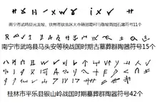 Sawveh ("etched script", /θaːu˨˦weː˧/) refers to some 140 individual symbols inscribed on stonework, pottery, and bronzeworks excavated in western Guangxi, dating from the late Neolithic to the Bronze Age, the earliest examples being contemporary with the Shang Dynasty in the North China Plain.[2][1][3] The glyphs bear some semblance to the glyphs of the Hemudu culture, Wucheng culture, Maqiao ruins (stratum V), Taihu Late Neolithic, and other Old Yue ruins in Guangdong.[2][3] Some scholars suggest that these inscriptions are characteristic of an undeciphered logographic writing system or proto-writing, but this is disputed due to the lack of evidence of complete phrases.[2]