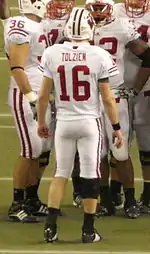 The winner of a spring quarterback competition, Tolzien beat out starter Sherer in 2009. He set the Wisconsin record for completions in a single season, with 211, and passed for 2,705 yards.[7] Under Tolzien's leadership, Wisconsin finished the season at 9–3.[8] He threw a pair of interceptions that were returned for touchdowns in a loss at Ohio State and threw three interceptions against Iowa the following week.[9][10] Despite this, Tolzien played well in games against Michigan, Minnesota, and Michigan State, and was named Big Ten Offensive Player of the Week for his efforts against Michigan State.[11][12][13]