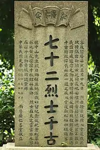 The dead were buried together in one grave on the Yellow Flower Mound, a mound near where they fought and died which has lent its name to the uprising.[2] After the Chinese revolution, a cemetery was built on the mound with the names of those 72 revolutionary nationalists. They were commemorated as the "72 martyrs."[2] Some historians believe that the uprising was a direct cause of the Wuchang uprising, which eventually led to the Xinhai Revolution and the founding of the Republic of China. Among the martyrs who sacrificed is Revolutionary Lin Jue-min.[4]