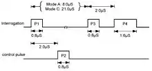 There are several modes of interrogation, each indicated by the difference in spacing between two transmitter pulses, known as P1 and P3.[7] Each mode produces a different response from the aircraft. A third pulse, P2, is for side lobe suppression and is described later. Not included are additional military (or IFF) modes, which are described in Identification Friend or Foe.