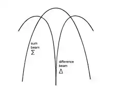 The new Mode S system was intended to operate with just a single reply from an aircraft, a system known as monopulse. The accompanying diagram shows a conventional main or "sum" beam of an SSR antenna to which has been added a "difference" beam. To produce the sum beam the signal is distributed horizontally across the antenna aperture. This feed system is divided into two equal halves and the two parts summed again to produce the original sum beam. However the two halves are also subtracted to produce a difference output. A signal arriving exactly normal, or boresight, to the antenna will produce a maximum output in the sum beam but a zero signal in the difference beam. Away from boresight the signal in the sum beam will be less but there will be a non-zero signal in the difference beam. The angle of arrival of the signal can be determined by measuring the ratio of the signals between the sum and difference beams. The ambiguity about boresight can be resolved as there is a 180° phase change in the difference signal either side of boresight. Bearing measurements can be made on a single pulse, hence monopulse, but accuracy can be improved by averaging measurements made on several or all of the pulses received in a reply from an aircraft. A monopulse receiver[15] was developed early in the UK Adsel programme and this design is still used widely today. Mode S reply pulses are deliberately designed to be similar to mode A and C replies so the same receiver can be used to provide improved bearing measurement for the SSR mode A and C system with the advantage that the interrogation rate can be substantially reduced thereby reducing the interference caused to other users of the system.[19]