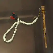 A bow from the Seneca was donated to the Smithsonian Institution in 1908.[19] It is made of unbacked hickory, and is 56.25 inches tip to tip. Although the string is missing for the specimen, when strung it would make a good "D" shape with slightly recurved tips, and was obviously made for bigger game. The tips are irregular in shape, which is typical from this region.[20]