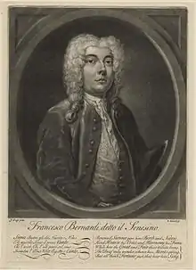 Senesino (pronounced [seneˈziːno]; or traditionally [seneˈsiːno]; born Francesco Bernardi [franˈtʃesko berˈnardi] on 31 October 1686 – 27 November 1758) was a celebrated Italian contralto castrato, particularly remembered today for his long collaboration with the composer George Frideric Handel.