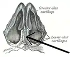 ![]() Cartilages of the nose, seen from below (cartilage of septum visible in blue at bottom center) | |