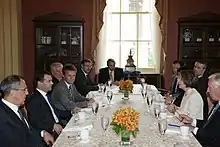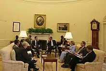 On 29 December 2016, the same day that the United States announced new sanctions against Russia for interfering with the election, Kislyak and then-U.S. National Security Advisor designate Michael Flynn had multiple telephone conversations and exchanged text messages.[31] The phone calls are the subject of an investigation by U.S. counterintelligence agents. White House Press Secretary Sean Spicer stated in early January 2017 that the calls related to arranging a conversation between Donald Trump and Vladimir Putin.[31] However, Kislyak's calls were monitored under standard foreign intelligence practice, and it was revealed that Flynn and Kislyak had discussed sanctions.[32][33] On 13 February 2017, Flynn was forced to resign from his position as National Security Advisor over his communication with Kislyak.[34]