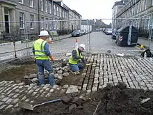 A sett, also known as a block, Belgian block[1] or sampietrini, is a broadly rectangular quarried stone used in paving roads and walkways.[2][3] Formerly in widespread use, particularly on steeper streets because setts provided horses' hooves with better grip than a smooth surface, they are now encountered rather as decorative stone paving in landscape architecture. Setts are often wrongly referred to as "cobblestones", although a sett is distinct from a cobblestone in that it is quarried or worked to a regular shape, whereas the latter is generally a small, naturally-rounded rock. Setts are usually made of granite.