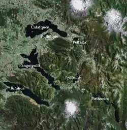 All the seven lakes are located at least partly within the Panguipulli commune that promotes tourism in the area. The area is surrounded by four volcanoes; Villarrica,[1] Quetrupillán, Lanín and Mocho-Choshuenco.[1] Due to geothermal activity there are several hot springs in the zone, including Liquiñe.