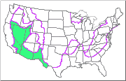 The Sevier Fold and Thrust Belt extends from southern California near the Mexican border to Canada.[1] Basin and Range faults cut the older Sevier thrust faults.[4] The Sevier orogeny was preceded by several other mountain-building events including the Nevadan orogeny, the Sonoman orogeny, and the Antler orogeny, and partially overlapped in time and space with the Laramide orogeny.