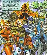 ![]() The Shadow Cabinet confronts Dharma. Art by John Paul Leon. | |