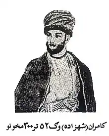 Shahzada Kamran Durrani (Persian شہزادہ کامران درانی) was born in the Sadozai dynasty. He was the son of Mahmud Shah Durrani, son of Timur Shah Durrani[1] the son of Ahmad Shah Durrani,[2] the founder of the Durrani Empire.