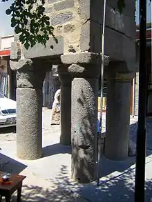 The stand-alone minaret in the form of a quadratic prism is erected on four massive stone columns. In the "Diyarbakır Salnâmeleri" (Yearbooks of Diyarbakır), it is recorded that the tower was built in 906 as a stable and high structure, and was converted into a minaret with the construction of the mosque next to it after the conquest of the region by Islamic people.[1][3] Today, local people construe that the four columns at the minaret's base symbolize the four main denominations of Sunni Islam , namely Hanafi, Hanbali, Maliki and Shafi'i.[2][4]