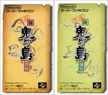 Nine years after the release of the Disk System version, BS Shin Onigashima (BS新・鬼ヶ島) was released on September 29, 1996, for the Super Famicom's Satellaview unit.[4] The game was broadcast via the St.GIGA BS Satellite, and was downloadable within the BS-X menu from the Broadcast Clubhouse (語り部の小屋, Katari bu no Koya).[4] BS Shin Onigashima takes its plot from the original version of the game, but is mostly presented from the viewpoint of the three helpers who join the protagonists during the game (the dog, monkey and pheasant).[5] In-game music was transmitted via radio, and Ittaisan, the game's narrator, appears in-between chapters to sum up the storyline via SoundLink. The character of Ittaisan was voiced by Ichirō Nagai. The Satellaview version was well received by fans.[5][6]