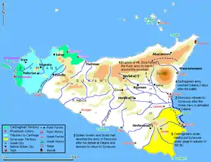 Carthage had previously invaded Sicily in 406 BC, in retaliation of Greek raids on Phoenician lands. This expedition was first commanded by Hannibal Mago who, after the Siege of Akragas by his kinsman Himilco, had managed to capture and sack the cities of Akragas, Gela and Camarina by the summer of 405 BC. These defeats had caused political turmoil in Syracuse, and had ultimately brought Dionysius to power as tyrant.[1] Himilco and Dionysius signed a peace treaty in 405 BC, which left Carthage in direct or indirect control of 60% of Sicily. The cities of Messina and Leontini were left independent, and Dionysius was acknowledged as the ruler of Syracuse by Carthage.[2]