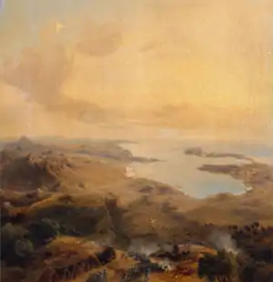 Lángara ordered Don Pedro Cotiella to take three boats into the arsenal to destroy the French fleet. Sir Sidney Smith, who had recently arrived, volunteered to accompany him with his ship Swallow and three British boats. Cotiella was tasked with sinking Toulon's hulks; one was a disarmed former British frigate captured during the American Revolutionary War, Montréal, and the other was the French frigate Iris.[11] These ships contained the gunpowder stores for the entire fleet and due to the danger of explosion were anchored in the outer roads, some distance from the city. He was then instructed to enter the Old Arsenal and destroy the ships there. The dock gates, which had been barred against attack and manned by 800 former galley slaves freed during the retreat. Their sympathies were with the advancing Republicans so to ensure that they did not interfere, Smith kept his guns trained on them throughout the operation.[12] His boats were spotted by the Republican batteries on the heights and cannonballs and shells landed in the arsenal, although none struck Smith's men. As darkness fell Republican troops reached the shoreline and contributed musketry to the fusillade; Smith replied with grapeshot from his boat's guns.[13]