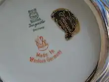 The three companies bought and used porcelain blanks from several well known producers such as Rosenthal, Hutschenreuther, Thomas Bavaria, Krautheim & Adelberg and marketed the finished products under their own names. They also produced silver overlay glass in the same manner. A large amount of glassware came from WMF[19] in Geislingen, which is not far from Schwäbisch Gmünd. A respectable amount of glass to be overlaid also came from Jean Beck,[20] a famous glass designer in Munich. Until recently, it was believed that Beck created the brilliant silver designs himself and that Deusch only produced them. However, this was not the case. As with the porcelain, Deusch and others bought the delightfully stylized glass blanks, decorated them in silver overlay, and sold them under their own names.