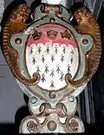 He was a son of Simon Leach (died 1579) of Crediton in Devon, a blacksmith, by his wife Elizabeth Rowe, daughter of John Rowe of Crediton.[5] The arms of Leach of Cadeleigh (Ermine, on a chief indented gules three ducal coronets or) are those of the ancient Leche family of Carden, near Chester, which estate held by the family until the late 20th century had been acquired during the reign of King Henry IV (1399–1413) by John Leche (descended from the family of Leche of Chatsworth in Derbyshire) on his marriage to Lucy Cawarden, heiress of Carden.[6]