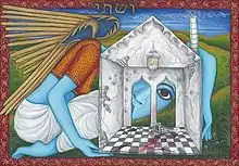 Growing up in India, assimilation was expected in much of her daily life, and so "identity" and "mutual understanding" became major themes in Benjamin’s art.[6] Her culturally diverse background informs her approach to art. Her work is influenced by biblical subject matter, reflections on gender and an interest in Midrashic process. Much of her imagery reflects Indian mythology in an effort to reveal what shapes both physical and spiritual identity. In her series "Finding Home", begun in the late 1990s, and in other work, Benjamin colors figures blue. Ori Soltes, professor and curator, comments, "She applies a skin color most frequently associated with a male--the Hindu god, Krishna--to female figures, forcing the viewer to stop and rethink whatever she thought she knew about that association."[7] Also at the core of her work is an ecumenical and empathetic spirit that comes from the very core of Jewish experience. Stylistically amalgamating Indian/Persian miniatures with pop culture, Christian and Jewish illuminated manuscripts, and Jewish and Hindu mythology, Siona also brings her canvas characters to life through animation and performance dance artists.[8]
