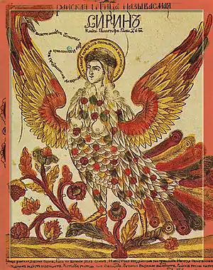 This half-woman half-bird is directly based on the later folklore about sirens.[2][3][4] She was usually portrayed wearing a crown or with a nimbus.[5] Sirin sang beautiful songs to the saints, foretelling future blisses. The bird was dangerous. Men who heard her would forget everything on earth, follow her, and ultimately die. People would attempt to save themselves from Sirin by shooting cannons, ringing bells and making other loud noises to scare the bird off.[3] Later (17-18th century), the image of Sirin changed and she started to symbolize world harmony (as she lives near paradise). People in those times believed only happy people could hear a Sirin, while only very few could see one because she is as fast and difficult to catch as human happiness. She symbolizes eternal joy and heavenly happiness.[6]