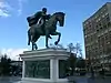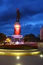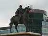 Perhaps the main symbol of the Skopje 2014 project is the Warrior on a Horse (Macedonian: Воин на коњ) statue and fountain in the centre of Macedonia Square. It was typically thought to depict Alexander the Great, though it was not officially named for him.[71][72][73] A plaque was later added to the statue which confirmed that the statue was dedicated to Alexander the Great.[74]