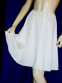 A slip is a woman's undergarment worn beneath a dress or skirt. A full slip hangs from the shoulders, usually by means of narrow straps, and extends from the breast to the fashionable skirt length. A half slip (or waist slip) hangs from the waist. The word "petticoat" may also be used for half or full slips.