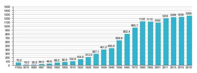 The population of Sofia declined from 70,000 in the late 18th century, through 19,000 in 1870, to 11,649 in 1878, after which it began increasing.[26] Sofia hosts some 1.24 million[10] residents within a territory of 492 km2,[27] a concentration of 17.9% of the country population within the 200th percentile of the country territory. The urban area of Sofia hosts some 1.54 million[11] residents within 5723 km2, which comprises Sofia City Province and parts of Sofia Province (Dragoman, Slivnitsa, Kostinbrod, Bozhurishte, Svoge, Elin Pelin, Gorna Malina, Ihtiman, Kostenets) and Pernik Province (Pernik, Radomir), representing 5.16% of the country territory.[7] The metropolitan area of Sofia is based upon one hour of car travel time, stretches internationally and includes Dimitrovgrad in Serbia.[28] The metropolitan region of Sofia is inhabited by a population of 1.67 million.[12]