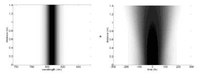 Now we let this pulse propagate through a fibre with , it will be affected by group velocity dispersion. For this sign of D, the dispersion is anomalous, so that the higher frequency components will propagate a little bit faster than the lower frequencies, thus arriving before at the end of the fiber. The overall signal we get is a wider chirped pulse, shown in the upper right of the picture.