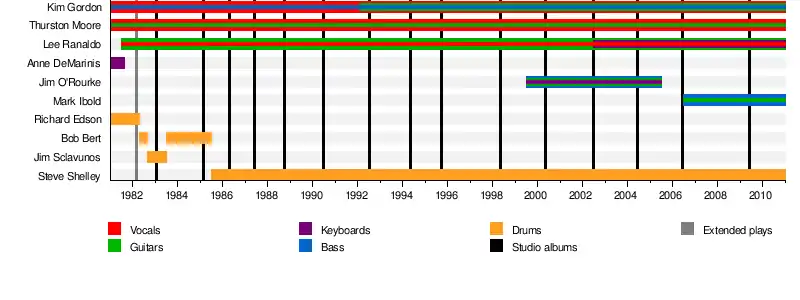 ![]() Final lineup of the band before their 2011 breakup; from left to right: Thurston Moore, Kim Gordon, Lee Ranaldo, Mark Ibold, Steve Shelley | |