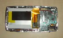 The following image shows an NW-A805 player opened. On the left hand side you can see the battery, on the right hand side the electronic board.
