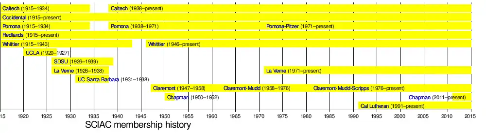 The SCIAC was founded in 1915 with five member schools with the goals to promote amateurism in athletics. The five founding members, all of whom are still members, are California Institute of Technology, Occidental College, Pomona College, the University of Redlands, and Whittier College. Although all five original charter members are still affiliated with the SCIAC, only two, Occidental and Redlands, have had uninterrupted membership. The acronym SCIAC (standing for Southern California Interscholastic Athletic Council) was in use during 1913 and 1914 until that organization became the CIF Southern Section.[1]