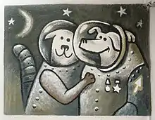 Strelka went on to have six puppies with a male dog named Pushok who participated in many ground-based space experiments, but never made it into space.[15] One of the puppies was named Pushinka (Пушинка, "Fluffy") and was presented to President John F. Kennedy by Nikita Khrushchev in 1961. A Cold War romance bloomed between Pushinka and a Kennedy dog named Charlie, resulting in the birth of four puppies that JFK referred to jokingly as pupniks.[16] Two of their puppies, Butterfly and Streaker, were given away to children in the Midwest. The other two puppies, White Tips and Blackie, stayed at the Kennedy home on Squaw Island but were eventually given away to family friends.[15] Pushinka's descendants were still living at least as of 2015.[17] A photo of descendants of some of the Space Dogs is on display at the Zvezda Museum in Tomilino outside Moscow.[18]