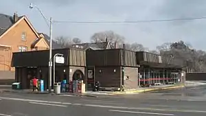 The main entrance to the Yonge–University line part of the station is concealed inside a house at 85 Spadina Road, which was built in 1899 and listed as a heritage property by the City of Toronto in 1974.[5] The building was designed by architect Robert Ogilvie[6] for lawyer Norman Gash. The property had previously been needed for construction of the Spadina Expressway, which was cancelled in 1971. Since it was still planned to build the subway on its original route along the course of the expressway, the site was subsequently acquired by Metropolitan Toronto in 1972, with the intention of replacing it with a new station building. Local protest forced the TTC to repurpose the old building, thereby retaining the residential character of the neighbourhood.[7][8] Opposite the house, on the west side of Spadina Road at Kendal Avenue, there is an uncovered stairwell entrance to the station mezzanine. There are northbound and southbound bus stops outside the entrances. This entrance only accepts Presto cards.