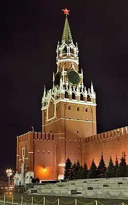 The Spasskaya Tower (Russian: Спасская башня, tr. Spasskaya Bashnya), translated as 'Saviour Tower', is the main tower on the eastern wall of the Moscow Kremlin which overlooks Red Square.