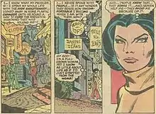 In her first appearance, Spider-Woman was to be an actual spider evolved into a human as imagined by writer/co-creator Goodwin.[4] Her debut was shortly followed by a four-issue story arc in Marvel Two-in-One in which Wolfman presented a different origin retcon as he felt her original origin was too implausible for mid-1970s readers.[3] During this arc and the premiere issue of her own comic, Spider-Woman was identified as the human, Jessica Drew (combining the first name of Wolfman's daughter and the last name of fictional detective Nancy Drew[3]), who had memories of being a spider implanted into her by the terrorist group HYDRA. Her costume was also redesigned for her series so that her long hair was uncovered, becoming a prominent part of the character's appearance.