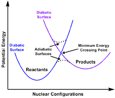 Spin-forbidden reactions formally fall into the category of electronically non-adiabatic reactions.[3] In general, potential energy surfaces fall into either the adiabatic and diabatic classification. Potential Energy Surfaces that are adiabatic rely on the use of the full electronic Hamiltonian, which includes the spin-orbit term. Those that are diabatic are likewise derived by solving the eigenvalues of the Schrödinger equation, but in this case one or more terms are omitted.[4]