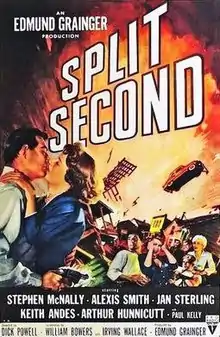 Split Second is a 1953 American film noir thriller directed by Dick Powell about escaped convicts and their hostages holed up in a ghost town, unaware of the grave danger they are in. It features Stephen McNally, Alexis Smith, Jan Sterling, and Keith Andes.[2]