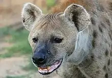 The spotted hyena (Crocuta crocuta), also known as the laughing hyena,[3] is a hyena species, currently classed as the sole extant member of the genus Crocuta, native to sub-Saharan Africa. It is listed as being of least concern by the IUCN on account of its widespread range and large numbers estimated between 27,000 and 47,000 individuals.[1] The species is, however, experiencing declines outside of protected areas due to habitat loss and poaching.[1] The species may have originated in Asia,[4] and once ranged throughout Europe for at least one million years until the end of the Late Pleistocene.[5] The spotted hyena is the largest known member of the Hyaenidae, and is further physically distinguished from other species by its vaguely bear-like build,[6] its rounded ears,[7] its less prominent mane, its spotted pelt,[8] its more dual purposed dentition,[9] its fewer nipples[10] and the presence of a pseudo-penis in the female. It is the only mammalian species to lack an external vaginal opening, having a pseudo-penis instead.[11]