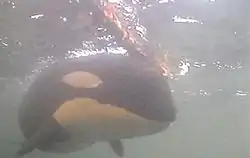 Springer had developed a pattern of approaching and rubbing against boats, creating a high risk of being hit by a vessel in the busy area or capsizing a small boat. One Seattle-based group, Project SeaWolf, began regularly observing and tracking the calf on the water, documenting a number of orca-boat interactions, including potentially dangerous interactions with private boats and a Washington State ferry. The group captured surface and underwater video of the orca that they disseminated to the media, urging federal intervention. Springer's attraction to boats and floating logs was attributed to needing social interaction and touch.[8] Dr. John Ford observed later that, "She didn't have whales to associate with down there, so boats sort of became a replacement for that for social reasons."[9]