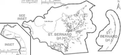 St. Bernard Parish (French: Paroisse de Saint-Bernard; Spanish: Parroquia de San Bernardo) is a parish located in the U.S. state of Louisiana. As of the 2010 census, the population was 35,897.[2] The parish seat and largest community is Chalmette.[3] The parish was formed in 1807.[4]