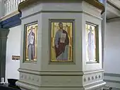 The church's interior reflects the restoration carried out in 1960 under the leadership of Rolf Graae in collaboration with Paul Høm from nearby Gudhjem who contributed the church's colourful artwork. The pulpit is decorated with paintings of the four evangelists while a mosaic above the chancel arch depicts one of the oldest symbols of Christianity, the Paschal Lamb with the flag of victory and the chalice of blood. In 1974, the collaboration between Graae and Høm continued when they designed the facade for the new organ built by Bruno Christiansen and Sons from Jutland. Finally, in 1981 Høm completed the large paintings behind the altar: the dark-blues of Jesus' burial surmounted by the golden tones of the risen Christ.[4]