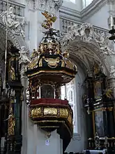 The local artists Johann Seitz and Matthias Högenwald of Passau made the black and gold side altars in 1678. The high altar was designed in 1712 by Christoph Tausch, a Jesuit architect from Breslau, with a 1714 painting of the fallen angel by Carlo Innocenzo Carlone. The pulpit is thought to have been made by Joseph Matthias Götz, completed in 1715. The organ casing was carved in 1715 by Joseph Hartmann. The church has paintings by artists such as Johann Spillenberger, Frans de Neve and Bartolomeo Altomonte.[7] Large statues of angels are the work of Diego Carlone with stucco by Ignaz Albrecht Provisore.