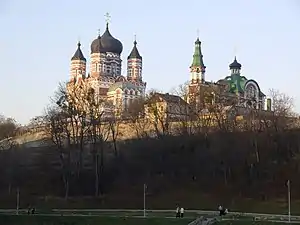 The Cathedral of St. Pantaleon or St. Panteleimon is a large Eastern Orthodox cathedral in the Kyivan neighbourhood of Theophania. It shares similarities with the Alexander Nevsky Cathedral, Tallinn and is considered a high point in Russian Revival ecclesiastical architecture.