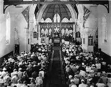 The present building, opened in 1962, was designed by the noted Australian architect Louis Williams to become the cathedral for the proposed Diocese of the Mornington Peninsula following the planned division of the Diocese of Melbourne.[3] Although the Melbourne diocese remained intact, St Andrew's was completed to be one of the largest church buildings in Australia; its vast and versatile space has been described as the "Cathedral of Light".[4]