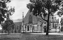 By 1857, the congregation had outgrown the second church building.[4] The parishioner, Brighton resident and prolific Melbourne architect Charles Webb, and his partner Thomas Taylor, were commissioned to design a new bluestone church, school house and vicarage.[9] "King Webb" designed the new bluestone church in the Early English Gothic style, with a prominent bellcote surmounting the gable, a small gabled western entrance porch, a seven-bay nave and small chancel. Webb's building was considered "one of the more perfect examples of a church of the period in the Colony"[10] and the majority of the building, including the distinctive western facade, remains a Brighton landmark.