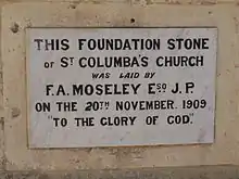 Construction began on 20 November 1909, when the first stone was laid by F. A. Moseley. A foundation stone on the front wall of the church building reads, "This foundation stone of St Columba's church was laid by F.A. Moseley E.s.q. J.P. on the 20th November 1909 'To the Glory of God.'"